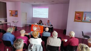 C’est un public attentif de 30 personnes qui a suivi l’information pour les aides aux séniors donnée par Valérie STAES chargée de mission « politiques autonomie » au sein de de l’Union Des CCAS (Centre Communal d’Action Sociale) du Nord[1] et on ne peut que regretter qu’il n’y ait pas eu plus de participants pour profiter de l’expertise de l’intervenante.